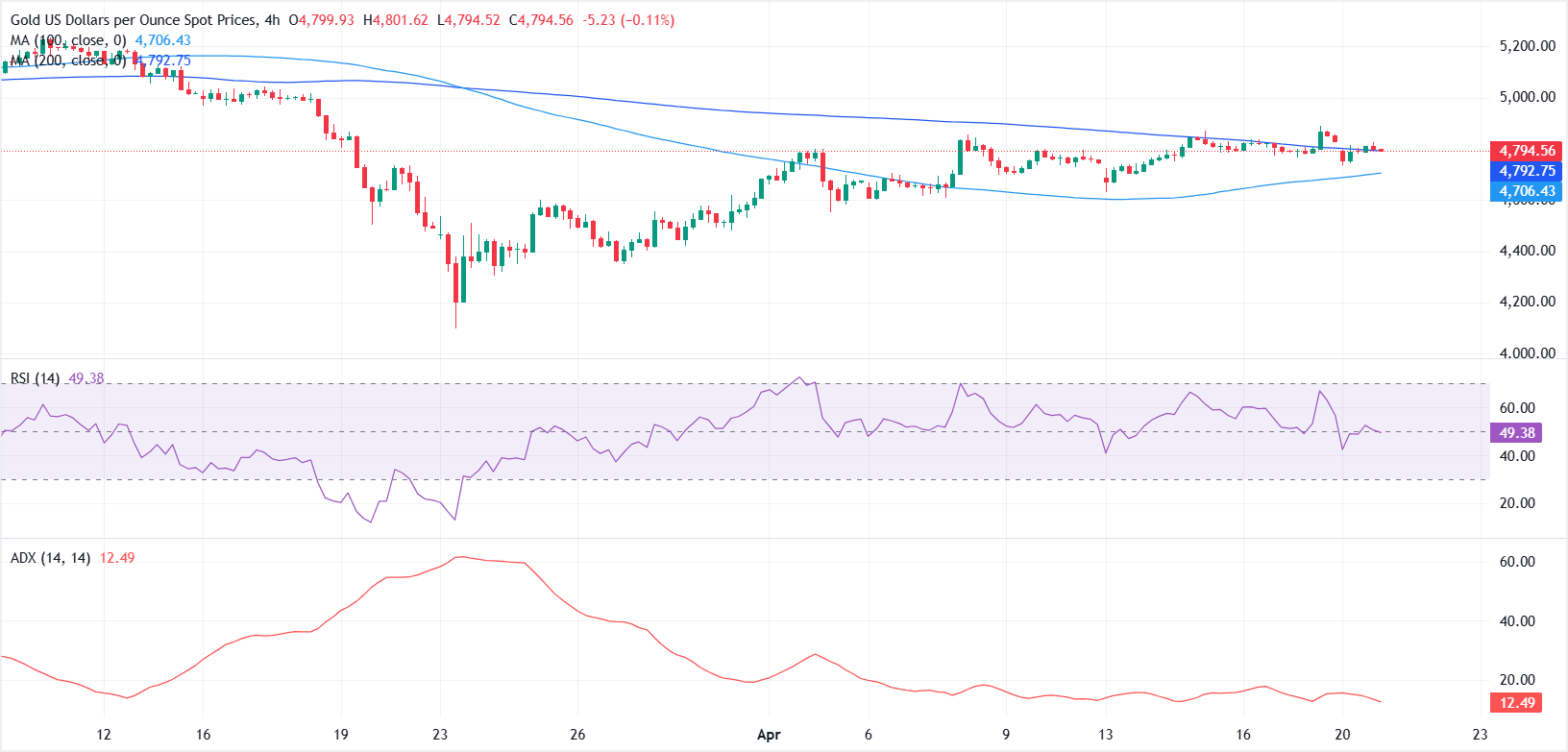 In the 4-hour chart, XAU/USD holds a mild bullish bias as it clings to a narrow support band defined by the 200-period Simple Moving Average (SMA) at $4,794, with the 100-period SMA much lower near $4,706, suggesting the broader uptrend structure remains intact despite the latest consolidation.