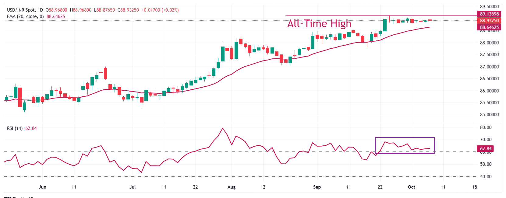 US Dollar Index trades firmly despite US government shutdown The Indian Rupee continues to hold its all-time low against the US Dollar at around 89.10, even as the latter strengthens amid the US government shutdown. At the press time, the US Dollar Index (DXY), which tracks the Greenback’s value against six major currencies, trades 0.35% higher to near 99.00, the highest level seen in two months. The US Dollar gains as its safe-haven demand has increased, with investors remaining cautious that the closure of federal agencies could lead to significant cuts in spending programs and mass lay-offs. On Tuesday, US President Donald Trump announced that the White House could eliminate a string of government plans amid ongoing government closure and would provide details on laying off employees in the next four or five days, Reuters reported. Such a scenario would be unfavourable for the US economic growth and allow Federal Reserve (Fed) officials to turn dovish on the monetary policy outlook. Currently, traders see an 82% chance that the Fed will cut interest rates by 25 basis points (bps) in each of its two policy meetings remaining this year, according to the CME FedWatch tool. For fresh cues on the monetary policy outlook, investors await Federal Open Market Committee (FOMC) minutes of the September meeting, which will be published at 18:00 GMT. Last month, the Fed delivered its first interest rate cut of the current financial year and reduced policy rates by 25 bps to 4.00%-4.25%. The Fed stated that the monetary policy adjustment became appropriate amid cracks in the job market, with the impact of tariffs on inflation remaining limited. Technical Analysis: USD/INR stays above 20-day EMA USD/INR stays in a tight range near the all-time high of 89.10 for almost two weeks. The near-term trend of the pair remains bullish as the 20-day Exponential Moving Average (EMA) slopes higher around 88.62.
